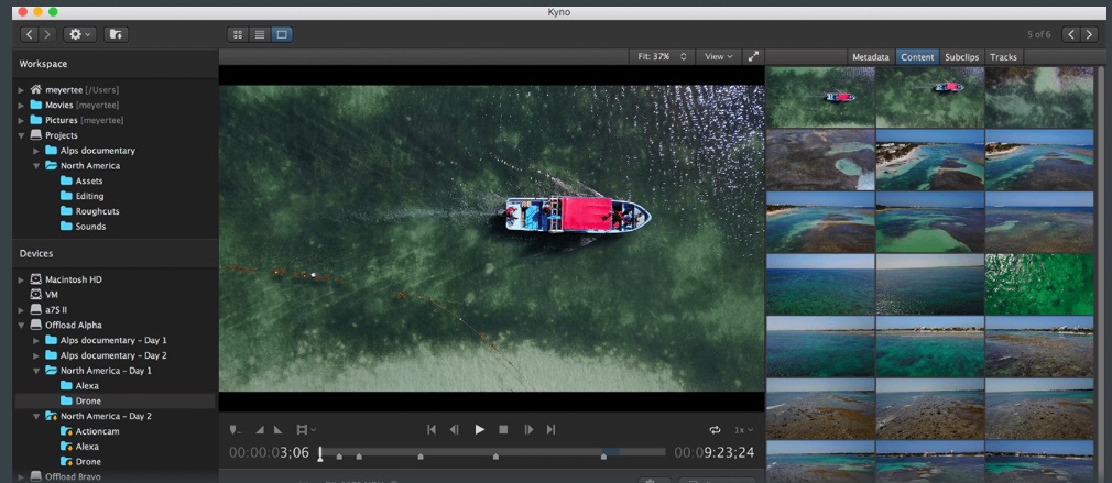 直接从硬盘驱动器或SD卡浏览视频,无需提取。使用Kyno强大的向下钻取功能来展平和过滤整个硬盘驱动器的内容,并定义可识别媒体的过滤器(例如帧率,分辨率)以查找所需的文件。
